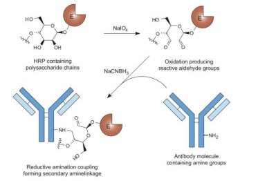 IVD領(lǐng)域隨著ELISA及酶促化學(xué)發(fā)光檢測技術(shù)的發(fā)展,酶偶聯(lián)抗體及其偶聯(lián)方法受到廣泛關(guān)注。目前常用的偶聯(lián)方法有過碘酸鈉氧化法、碳二亞胺法和SMCC異性雙功能偶聯(lián)法等?!禕IOCONJUGATE TECHNIQUES》中介紹了NaIO4 法標記HRP的原理(如圖1)。
