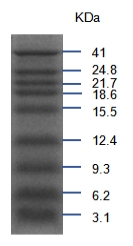 本產(chǎn)品包含了從3.1kDa到41kDa共9種蛋白質(zhì)(3.1,6.2,9.3,12.4,15.5,18.6,21.7,24.8,41 kDa)。在三羥甲基氨基甘氨酸(Tricine)-SDS-PAGE電泳過(guò)程中,用于判斷目的蛋白的分子量大小。