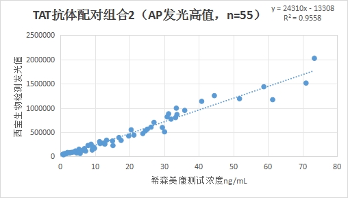 西寶TAT抗體配對(duì)組合2(<20 ng/mL)的發(fā)光值與希森美康 TAT發(fā)光試劑賦值臨床相關(guān)性R2在0.88左右。
