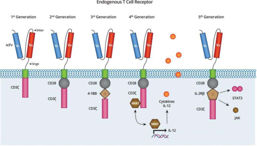 CAR結(jié)構(gòu)通常也由三部分組成,即胞外抗原結(jié)合區(qū)(一般為scFv)、跨膜結(jié)構(gòu)域以及胞內(nèi)激活結(jié)構(gòu)域。經(jīng)過多年發(fā)展,CAR結(jié)構(gòu)已經(jīng)發(fā)展至第四第五代,CAR結(jié)構(gòu)的改進(jìn)主要集中在胞內(nèi)共刺激結(jié)構(gòu)域。有學(xué)者在第四代CAR-T的設(shè)計中添加細(xì)胞因子或趨化因子受體結(jié)構(gòu),從而增加T細(xì)胞在腫瘤組織中的浸潤,達(dá)到增強(qiáng)殺傷實體瘤的效果。第五代CAR在共刺激域(如CD28或4-1BB)和CD3ζ鏈之間,插入了IL-2Rβ等細(xì)胞因子受體的胞內(nèi)片段,當(dāng)CAR結(jié)合抗原后,該片段包含的YXXQ基序(Y代表酪氨酸)招募并激活JAK激酶和STAT蛋白,從而同時啟動T細(xì)胞活化和細(xì)胞因子驅(qū)動的增殖信號。