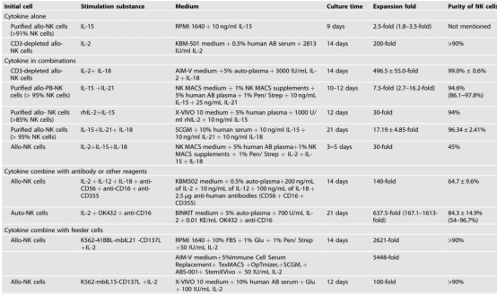 細(xì)胞因子是維持NK細(xì)胞存活和支持NK細(xì)胞體外增殖的關(guān)鍵成分,可以不需要滋養(yǎng)細(xì)胞的條件下培養(yǎng)細(xì)胞。然而,當(dāng)使用不同的細(xì)胞因子和培養(yǎng)條件時,發(fā)現(xiàn)具有不同的擴(kuò)增效率。