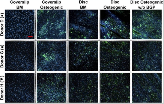 圖:人骨髓間充質(zhì)干細(xì)胞的骨細(xì)胞礦化熒光共聚焦圖像拍攝于第28天,比例尺:200微米【1】