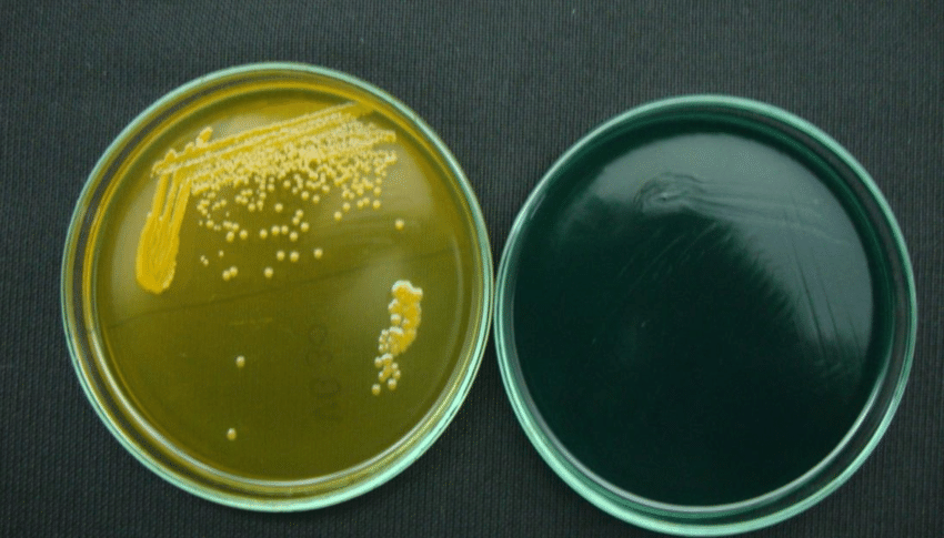 TCBS瓊脂培養(yǎng)基,用于致病性弧菌(霍亂、副溶血性弧菌)的選擇性分離培養(yǎng)(GB2008、SN標準)。組成成分:酵母粉 5.0 , 蛋白胨10.0, 硫代硫酸鈉10.0, 枸櫞酸鈉10.0, 牛膽粉5.0, 牛膽酸鈉3.0 , 蔗糖20.0 , 氯化鈉10.0, 檸檬酸鐵1.0 , 麝香草酚蘭0.04, 瓊脂15.0, pH值8.6 ± 0.1,保存溫度25℃。膽酸鈉、牛膽粉、硫代硫酸鈉和檸檬酸鈉及較高的pH可抑制革蘭氏陽性菌和大腸菌群;霍亂弧菌對酸性環(huán)境比較敏感,因此該pH值可增強其生長;硫代硫酸鈉與檸檬酸鐵反應作為檢測硫化氫產生的指示劑;溴麝香草酚蘭和麝香草酚蘭是pH指示劑;瓊脂是培養(yǎng)基的凝固劑。