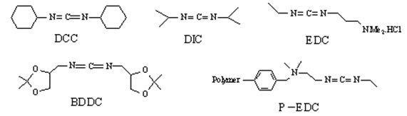 碳二亞胺(-N=C=N-)型縮合劑中以DCC, DIC, EDC, BDDC應(yīng)用廣泛, 價格相較便宜,適用于多肽的大規(guī)模制備。樹脂固載的EDC(P-EDC) 將縮合劑固載在高聚物上使反應(yīng)的后處理更為簡單。