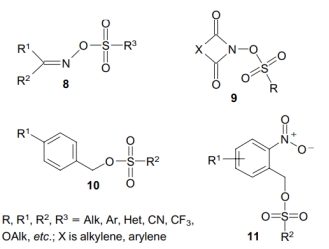 這類化合物中重要的是磺酸酯,它在光照下會(huì)產(chǎn)生強(qiáng)酸。他們包括亞氨基磺酸鹽 (化合物8), 酰亞胺磺(化合物9) 和芐基磺酸鹽(化合物10) 。在苯磺酸鹽中,只有對(duì)硝基和鄰硝基苯基磺酸酯(化合物11)在光照下產(chǎn)生酸[7],這些異構(gòu)體通過不同的機(jī)制產(chǎn)生光酸。非離子型PAG在有機(jī)溶劑和聚合物薄膜中具有較高的溶解度,但與鎓鹽相比,它們的熱穩(wěn)定性較差(可以通過進(jìn)一步的化學(xué)修飾進(jìn)行改進(jìn))。