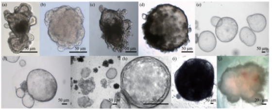 圖注:(a)小腸類器官形貌圖.(b)結(jié)腸類器官形貌圖.(c)食管類器官形貌圖.(d)胃類器官形貌圖.(e)肝臟類器官形貌圖.(f) 胰腺類器官形貌圖.(g)肺類器官形貌圖.(h)乳腺類器官形貌圖.(i)腎類器官形貌圖.(j) 腦類器官形貌圖
