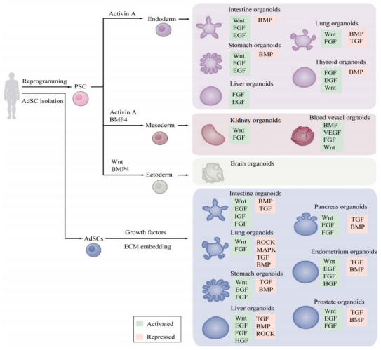 圖2,人PSC來源類器官和ASC來源類器官的形成過程(圖片來源:俞東紅, 曹華, 王心睿, 等. 類器官的研究進(jìn)展及應(yīng)用. 生物工程學(xué)報(bào), 2021, 37(11): 3961-3974