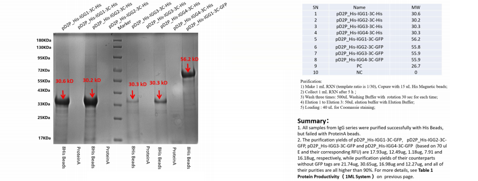 每個(gè)樣品的蛋白質(zhì)產(chǎn)量![]() | 在IgG系列的表達(dá)和純化試驗(yàn)中,檢測(cè) 了IgG1、IgG2、IgG3、IgG4和PC的產(chǎn)量分別是117.49,161.35,106.42,128.71和183.45μg/ml;它們?cè)?h的產(chǎn)量分別是170.50,251.77,164.64,192.56和225.54μg/ml。 |