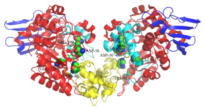 蔗糖磷酸化酶約有500個(gè)氨基酸,分子量在50-60 kD之間。不同來(lái)源的SPase有其獨(dú)特的蛋白結(jié)構(gòu)和底物特異性,來(lái)源于腸膜明串珠菌和變形鏈球菌的蔗糖磷酸化酶(LmSP、SmSP),是一種單體蛋白,而來(lái)自青春雙歧桿菌和嗜糖假單胞菌的SPase是一類二聚體。2004年,來(lái)源于青春雙歧桿菌(Bifidobacterium adolescentis)的蔗糖磷酸化酶(BaSP)的晶體結(jié)構(gòu)(PDB 2gdv)被首次解析。如圖 1所示,BaSP的晶體結(jié)構(gòu)由4部分組成:結(jié)構(gòu)域A、B、B'、C。結(jié)構(gòu)域A包含一個(gè)GH13家族所共有的結(jié)構(gòu) -- (β/α)8 桶,以及酶的活性位點(diǎn);結(jié)構(gòu)域B由2個(gè)反向平行的β-折疊和2個(gè)短的α-螺旋組成;結(jié)構(gòu)域B'包括一長(zhǎng)一短α-螺旋,其拓?fù)浣Y(jié)構(gòu)減小了底物通道的大小,不利于低聚糖的結(jié)合;結(jié)構(gòu)域C由一個(gè)5鏈反向平行的β-折疊組成,雖然所有GH13家族的酶都含有此結(jié)構(gòu)域,但僅在蔗糖磷酸化酶中存在折疊結(jié)構(gòu)[1]。