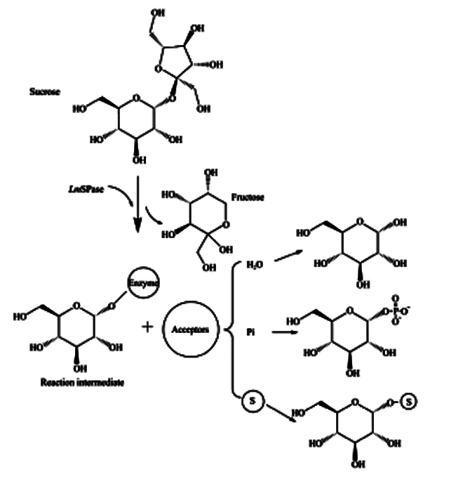 注:SPase與不同受體的反應(yīng),H2 O:水解反應(yīng);Pi:磷酸解反應(yīng);糖:轉(zhuǎn)糖基化反應(yīng)