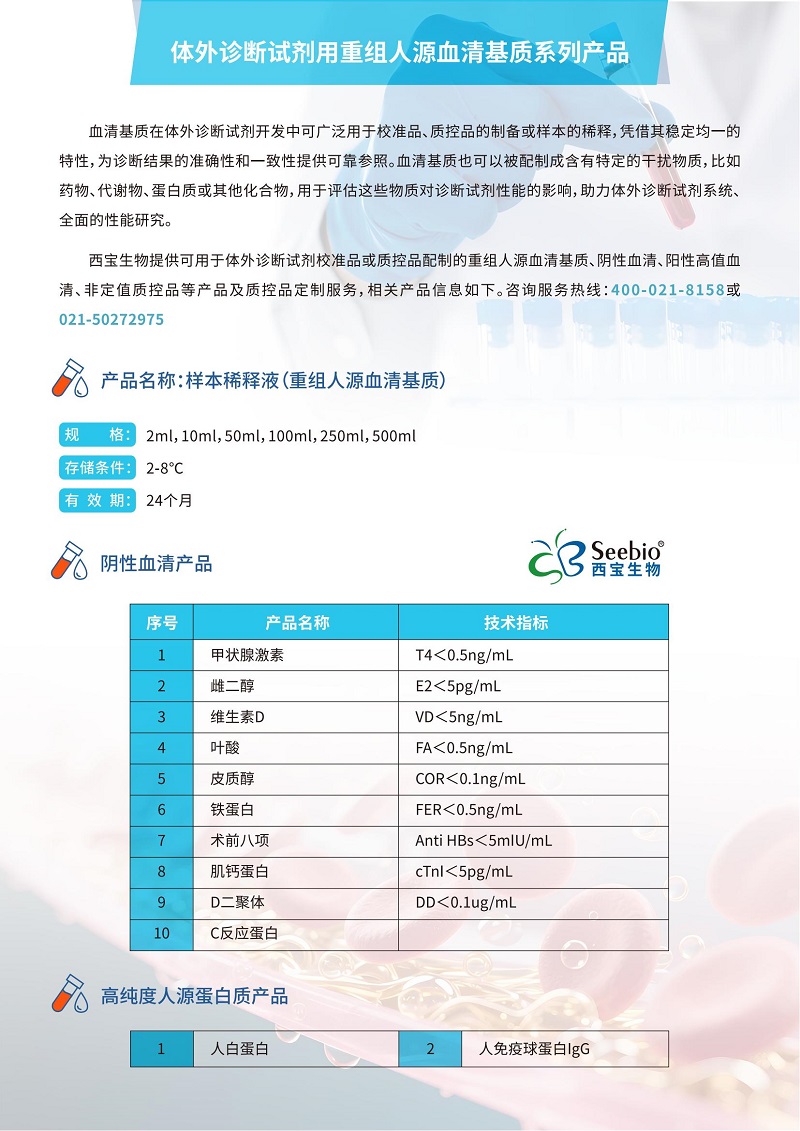 西寶生物提供可用于體外診斷試劑校準品或質(zhì)控品配制的重組人源血清基質(zhì)、陰性血清、陽性高值血清、非定值質(zhì)控品等產(chǎn)品及質(zhì)控品定制服務(wù),相關(guān)產(chǎn)品信息如下。咨詢服務(wù)熱線:400-021-8158或021-50272975