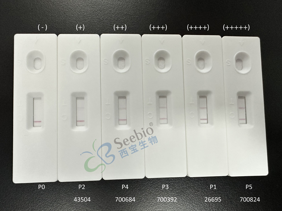 實(shí)驗(yàn)結(jié)果:在彩色乳膠免疫層析平臺(tái),采用此抗體配對(duì)組合測(cè)試稀釋后的P1-P5質(zhì)控均為陽性,表明此抗體配對(duì)測(cè)試靈敏度良好。