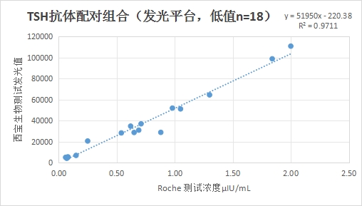 西寶TSH抗體配對(duì)低值部分(≤2μIU/mL) 的發(fā)光值與Roche TSH試劑臨床相關(guān)性R2>0.95;