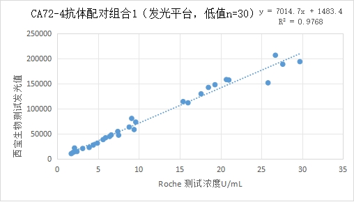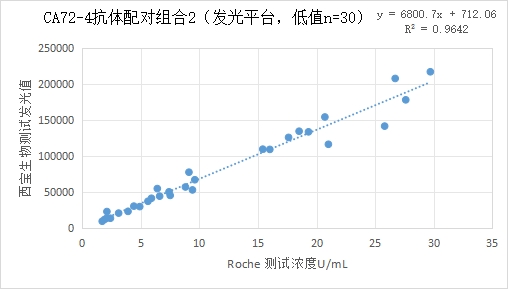 西寶CA72-4抗體配對(duì)低值部分(≤30U/mL) 的發(fā)光值與Roche CA72-4試劑臨床相關(guān)性R2>0.95;