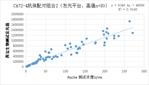 西寶CA72-4抗體配對(duì)高值部分(<300U/mL)的發(fā)光值與Roche CA72-4試劑臨床相關(guān)性R2>0.90。