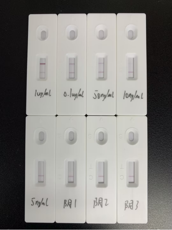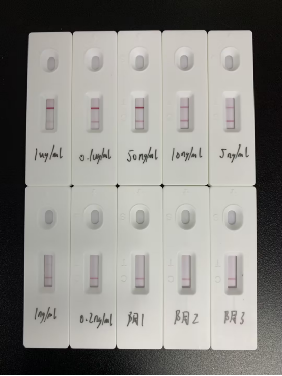 2.2.1抗體配對(duì)組合:呼吸道合胞病毒(RSV)抗體(貨號(hào):EKY0828B)標(biāo)記彩色乳膠(噴在釋放墊上)+呼吸道合胞病毒(RSV)抗體(貨號(hào):EKY0828A)劃膜劃膜;