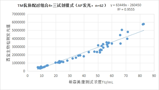 西寶生物發(fā)光(AE)平臺TM抗體配對組合2(三試劑模式)與希森美康 TM試劑(化學發(fā)光法)賦值的臨床樣本相關性R2>0.95,相關性良好。