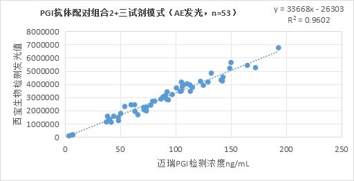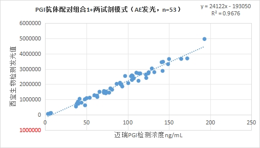 西寶生物發(fā)光(AE)平臺PGI抗體配對組合2(三試劑模式)與邁瑞醫(yī)療PGI試劑(化學(xué)發(fā)光法)賦值的臨床樣本相關(guān)性R2>0.95,相關(guān)性良好。