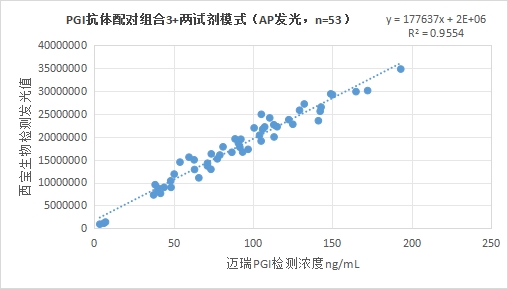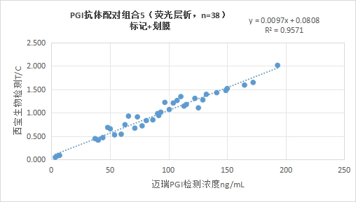 西寶生物熒光平臺PGI抗體配對組合5與邁瑞醫(yī)療PGI試劑(化學(xué)發(fā)光法)賦值的臨床樣本相關(guān)性R2>0.95,相關(guān)性良好。