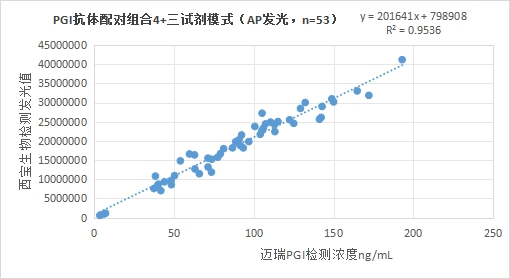 西寶生物發(fā)光(AP)平臺PGI抗體配對組合4(三試劑模式)與邁瑞醫(yī)療PGI試劑(化學(xué)發(fā)光法)賦值的臨床樣本相關(guān)性R2>0.95,相關(guān)性良好。