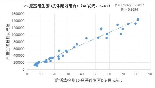 3.1.1 西寶生物發(fā)光(AE)平臺25-羥基維生素D抗體配對組合1與質(zhì)譜法賦值的臨床樣本相關(guān)性R2>0.95,相關(guān)性良好;