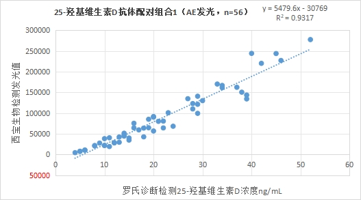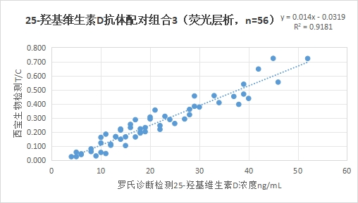西寶生物熒光免疫層析平臺25-羥基維生素D抗體配對組合3與羅氏診斷25-羥基維生素D試劑(電化學發(fā)光法)賦值的臨床樣本相關(guān)性R2>0.90,相關(guān)性較好。