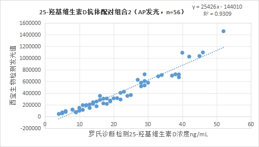 3.2.2西寶生物發(fā)光(AP)平臺25-羥基維生素D抗體配對組合2與羅氏診斷的25-羥基維生素D試劑(電化學發(fā)光法)賦值的臨床樣本相關(guān)性R2>0.90,相關(guān)性較好。
