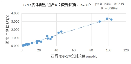 西寶生物熒光平臺G-17抗體配對組合5與亞輝龍G-17試劑(化學(xué)發(fā)光法)賦值的臨床樣本相關(guān)性R2>0.95,相關(guān)性良好;