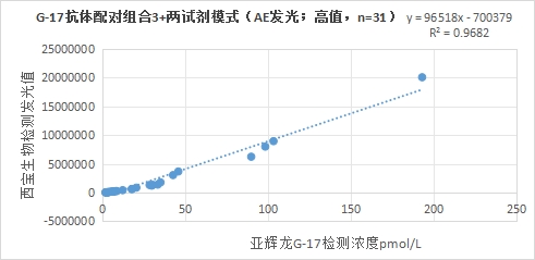 西寶生物發(fā)光(AE)平臺G-17抗體配對組合2(三試劑模式)與亞輝龍G-17試劑(化學(xué)發(fā)光法)賦值的臨床樣本相關(guān)性R<sup>2</sup>>0.95,相關(guān)性良好。