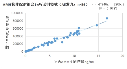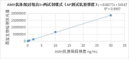 3.2.1西寶生物發(fā)光(AP)平臺AMH抗體配對組合3與羅氏診斷的AMH試劑(電化學(xué)發(fā)光法)賦值的臨床樣本相關(guān)性R2>0.95左右,相關(guān)性較好;