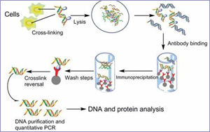 染色質(zhì)免疫沉淀技術(shù)(ChIP,Chromatin Immunoprecipitation Assay)通過與染色質(zhì)片段共沉淀和qPCR技術(shù),在體內(nèi)檢測與特異蛋白質(zhì)結(jié)合的DNA片段。ChIP技術(shù)較大的優(yōu)點就是在活體細胞狀態(tài)下研究了蛋白質(zhì)和目的基因結(jié)合狀況,減少了體外實驗的誤差。
